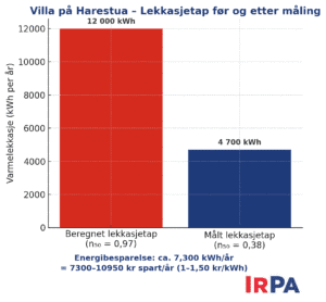 Med et oppvarmingsbehov på rundt 54 000 kWh i året, ville en villa av denne størrelsen og med et lekkasjetall på 0,97 normalt tape 10 800–13 500 kWh gjennom luftlekkasjer.